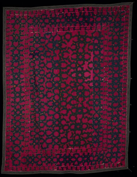 Curator: Ah, this crimson textile really grabs you, doesn't it? Editor: It's… hypnotic. Like a field of tiny, sparkling rubies. But there’s also something comforting about the repetition. Curator: This piece is titled "Head Cover (odni)," dating from around the 20th century. It is currently located here at the Minneapolis Institute of Art. The "odni" is crafted from cotton, showcasing geometric designs that draw inspiration from patterns and decoration, an element that resonates across art forms, challenging how labor and decorative patterns can signify cultural work. Editor: Interesting! Immediately, I see it's an anonymous creation, which invites a certain kind of speculation, a sort of blank canvas for imagination. Is this geometric pattern a coded language? Is there significance in this shade of red that feels both ancient and modern? It almost breathes; there's life there, not just in the color but the texture. Curator: Exactly, let’s consider the process, its potential maker. These cotton fibers tell a tale of cultivation and manual labor—and then of meticulous needlework. How was it made? And what about access to materials at the time of production and distribution of labor? All vital aspects to the art object we now have hanging here in front of us. Editor: It prompts us to reflect. Imagine, thousands of precise stitches. The slow work, meditation in motion… It also reflects how, within such constraint, something beautiful blossoms. The commitment of the hand is incredibly beautiful. You wonder who had the task and the reasons they devoted hours to the art piece, an act of profound, almost revolutionary artistry. Curator: I am curious how you feel knowing now what you didn't know before about the materiality of art and access to art? How the repetitive geometric design mirrors the systematic processes within labor at the time. Editor: Well, it makes me think about legacy… what parts of history and the working classes are lost to the archive…and those voices are finally, being centered. These works can be portals, if only we stop and look and honor them. Curator: Indeed. There's much to contemplate with this piece, isn't there? From labor to history and materials it really embodies so much of culture at the time. Editor: Absolutely. Next time, I'm definitely going to try wearing more color; It’s amazing what that small piece of fabric can evoke.
