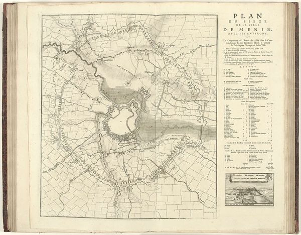 Editor: So, here we have Jacobus Harrewijn's 1706 etching, "Beleg van Menen, 1706," depicting the siege of the city. It's incredibly detailed, but also feels quite...distant. I'm struck by the objective point of view, like a bird's-eye view almost devoid of human presence besides what we can gather of military and infrastructural placements. How do you interpret this work, seeing it today? Curator: It's fascinating to consider how "objectivity" functions within such a charged image. This isn't just a map; it's a record of a violent power struggle. We need to ask, whose perspective is truly represented here? Whose lives are being mapped and manipulated? How does this imagery serve to sanitize what the real implications of violence in this historic event really looked like? Editor: That’s a really interesting way to put it – “sanitize.” It's true; it almost makes war look like urban planning. Curator: Exactly. This distance naturalizes violence and reinforces colonial power structures by reducing human conflict to a set of strategic placements. Do you see the detailed key off to the side? Think of all the nameless, faceless people implied by each one of those marks representing troop placements, artillery...it's not dissimilar to present-day digital surveillance and geographic targeting that is used for drone warfare. Editor: Wow, I hadn't thought of it in terms of surveillance...that definitely changes my perspective. Seeing it as an instrument of power and control. Curator: And who is its intended audience? What does it mean to document, even celebrate, the capture and subjugation of a population and location in such an ostensibly neutral form? Editor: It's a lot to consider. I initially saw it as just a historical document, but I now realize its more nuanced place as a document of power. Curator: Precisely, seeing it through that lens allows us to understand art's role in shaping our understanding of conflict and the forces that determine those conflicts.