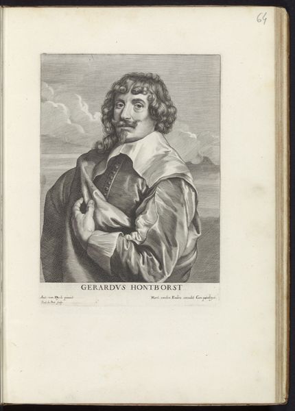 Curator: Oh, it’s rather arresting, isn't it? The directness of his gaze almost feels like he is present with us here. Editor: Right, and a bit melancholic if you ask me, almost brooding. I notice immediately the stark monochrome palette, obviously given it is an engraving. But also, it’s striking how the artist captured different textures within this constraint. Let's contextualize a bit: this is “Portret van Andreas Colijns de Nole,” an engraving possibly from the period 1630 to 1646, made by Pieter de Jode the Younger. It’s currently housed at the Rijksmuseum. Curator: Yes, I find myself quite taken by how he portrays Nole—with the sculpture included. I imagine that he worked as a sculptor in the Flemish Baroque. The ruffled collar seems so delicately rendered and then next to the strong musculature of the sculpture...it is the mark of a truly sensitive hand. Editor: Absolutely, it’s a real contrast. The production process for an engraving like this during the Dutch Golden Age interests me. De Jode had to meticulously translate a three-dimensional being into a two-dimensional image, accounting for light, shadow, and texture, all using lines carved into a copper plate. The printing would have also required specialized paper, ink, and skilled labor. These details mattered as materials spoke volumes. The engraver must have truly wanted to immortalize Mr. Colijns de Nole and give the artwork its gravity. Curator: A lasting impression! One wonders about their collaboration, if the work was done while both were together or produced later, maybe even from a drawing. It has such warmth to it. It whispers secrets about that era. It is really incredible that Mr. de Jode could extract so much feeling from cold metal and acid. I shall think of that the next time I handle some raw materials. Editor: And think of the copies of this image being distributed. Engravings facilitated knowledge and status because portraiture was accessible and transportable during a time without photography, changing how individuals engaged with visual culture. It emphasizes the artist's material intervention. Curator: Exactly, to look at his somber yet self-assured portrait and imagine his hands... I feel more connected somehow to time itself. Editor: A fitting encounter, all things considered.