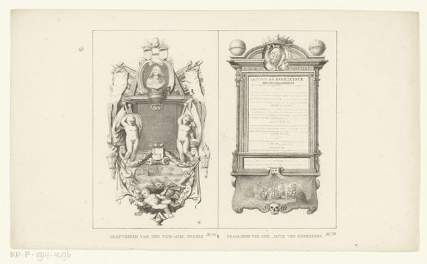 Curator: This is a drawing titled "Ontwerp voor een Prijscourant van een fotografisch atelier," or "Design for a Price List of a Photographic Studio," dating from 1901-1902, by Ernst Maximilian Büttinghausen. It combines ink and print on paper. Editor: What strikes me immediately is how much it resembles something etched rather than drawn. The paper itself seems like another tool contributing to the overall impression of something very fragile. Curator: Indeed. The design, heavily influenced by Art Nouveau, displays an intricate framework with decorative figures flanking the "Prijscourant" title, all exhibiting line work typical of that style. Look at how those cherubic figures uphold symbols of creation—what stories might those implements tell? Editor: Right, it's really laying bare the production, or promising transparency. The piece itself functions as advertising but through the lens of a delicate craftsmanship. The very materiality of the price list – its reliance on the handmade aesthetic despite being designed for mass communication – seems intentionally contradictory. What do you make of the faint numerical lists inside this decorated border? Curator: These numerals are like codes, hints that require deciphering of artistic symbolism as much as they inform about studio costs. It blends practicality and aesthetic intent. Observe how the geometric design also introduces formal symmetry and balance. Editor: It's as if Bütthinghausen seeks to ennoble the studio's labor by cloaking it in this refined artistry. To see commerce made precious. Curator: It presents an interesting dynamic; a reflection of its era perhaps. A commercial tool elevated via sophisticated artistic structure. Editor: It reveals a complex tension within the commercial world during a pivotal period. Curator: A unique intersection of utility and artistic sensibility worth pondering. Editor: And definitely something that inspires questions about artistic integrity.