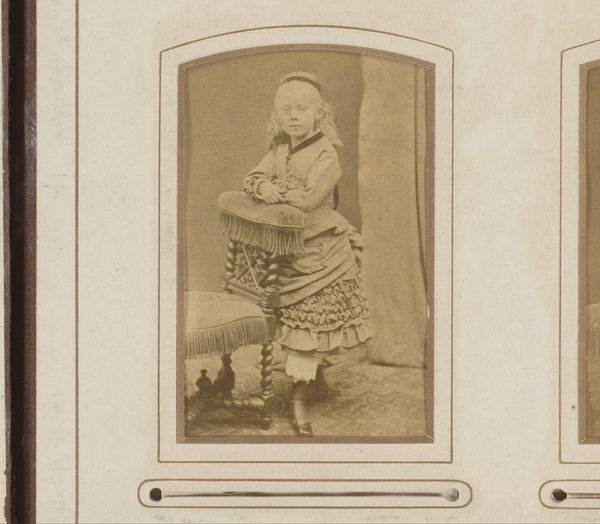 Hendrik Anthonie Karel Ringler made this portrait of a girl leaning on a chair sometime in the 19th century. It's a photograph, meaning that it emerged from a set of social and technological conditions specific to that time. Looking at this image, it's important to consider the cultural role of photography in the Netherlands during this period. Photography was becoming more accessible, but portraiture was still a formal affair, often emulating the conventions of painting. The girl's posture, leaning casually on the chair with crossed arms, is somewhat unusual for the time, perhaps suggesting a degree of self-awareness or a deliberate attempt to project a certain image. To understand this photograph better, we might look into the history of photography studios in the Netherlands, as well as the social expectations surrounding portraiture and the representation of children. These factors shape not only the image itself but also its reception and meaning.
