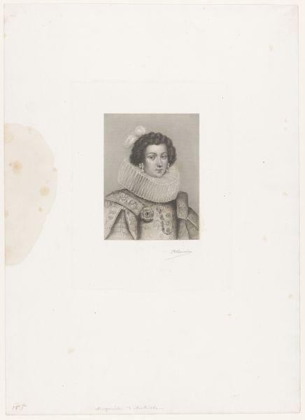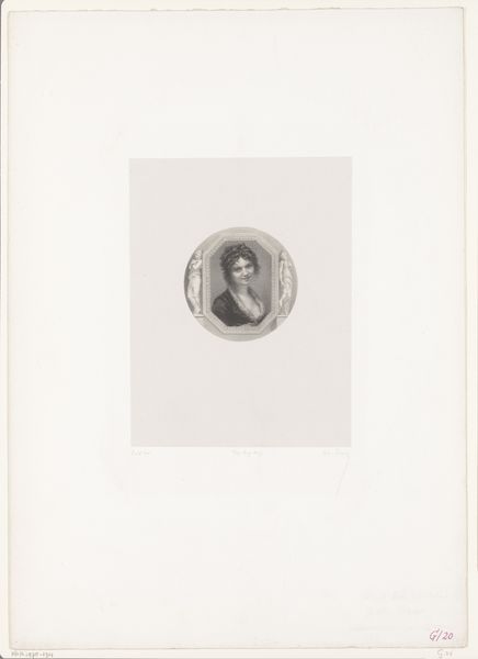 This is a lithograph portrait of Marg. Gerard. Caan van Hoekenburg-Van Hoogstraten, created by Johan Hendrik Hoffmeister. Lithography is a printmaking process that relies on the chemical repulsion of oil and water. A design is drawn on a stone or metal plate with a greasy crayon, then treated with acid and gum arabic. Ink adheres only to the greasy areas, which are then transferred to paper. This technique, developed in the late 18th century, democratized image production, enabling multiple reproductions at a relatively low cost. The stark contrast between light and shadow in this portrait results from the lithographic process, and the sharp lines lend the portrait a crisp formality. Hoffmeister skillfully uses the medium to capture the details of his sitter's dress and jewelry. Considering the social context, this portrait, like many lithographs of the era, reflects the rise of a middle class eager to participate in the visual culture of the time. This artwork blurs the boundaries between art and commercial production, showcasing the skilled labor involved in creating a mass-reproducible image.