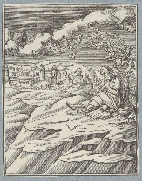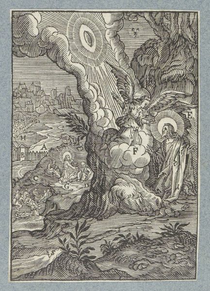 Editor: Here we have Christoffel van Sichem’s "Kaïn doodt Abel," created around 1645-1646. It's an engraving housed in the Rijksmuseum. The stark contrast immediately draws me in; it's so dramatic! What symbols do you see embedded in this scene? Curator: Indeed. Note the prominent depiction of sacrifice in the background, engulfed in flames. Doesn't that conjure notions of divine favor, or perhaps the lack thereof? And consider the positioning of Cain over Abel, a stark visual of dominance and broken kinship. Look, even the clouds roil with divine anger or sorrow at what is transpiring. How does this imagery strike you? Editor: The animals grazing peacefully nearby provide a haunting contrast to the violence. Also, is that the artist's symbol at the top left? Does that incorporate any personal meaning? Curator: Absolutely! That’s Sichem's mark, a form of visual signature, if you will. But consider beyond authorship – visual signatures or emblems like this were sometimes associated with particular guilds or printing houses, acting almost as a brand. Can you imagine the cultural weight these symbols carried? Editor: I see...so it's not just about what's depicted, but also about how the image communicates values through its design. Curator: Precisely. These images echo through history, carrying moral and social weight, reminding us of primal narratives that shape our understanding of good and evil, justice and vengeance. And sometimes even offering a glimpse into artistic identities of the period. Editor: I never considered how an artist’s mark could act as a signature, but also be a part of a much wider visual culture. It makes you wonder what future symbols will say about us. Curator: A vital point. Visuals resonate; they remind, instruct, and ultimately, define us. It has been truly thought-provoking to unpack this image and share this knowledge with you.