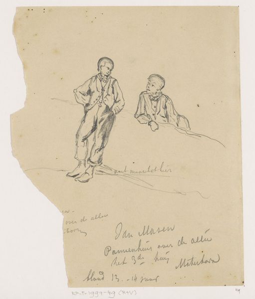 Curator: Ah, a striking ink drawing by Charles-Edouard Delort, dating to 1880. The title is simply "Flutist," and you can find it here at the Metropolitan Museum of Art. Editor: The first impression is one of immediacy, almost like a snapshot of someone caught mid-performance. The hatching is so dense, yet the figure has a light, almost ephemeral quality. Curator: Indeed. Consider the figure: He is seated, perhaps casually, yet the costume seems… out of time. What readings might emerge from this symbolic dissonance, a modern snapshot rendered as old iconography? Editor: Well, given that this is a work on paper, seemingly a study or a quick sketch, might it be part of Delort's wider interest in historical costume? The Met holds paintings where he presents very finished and detailed visions of people dressed in what look like 18th century clothes. This piece of sketchwork might provide access to his process and studio. Curator: Perhaps, the uniform might invoke historical context, but what of the flute itself? What enduring symbolism resides in such an instrument? To me, the flute carries hints of pastoral ease, a link to ancient, idealized simplicity—though here, its melancholic potential seems dominant. Editor: Yes, a melancholy certainly permeates the work. Perhaps the very immediacy, that quick, sketched feel contributes to that feeling of a transient moment caught in ink. Curator: And observe how the surrounding text bleeds onto the page. There's an intimacy there, as if the flutist and the handwritten thoughts exist in the same mental space, two parallel acts of creative expression occupying the same plane. It deepens my engagement. Editor: Absolutely. These smaller, more intimate works allow a view into an artist's creative thinking, something that often gets lost in grander, more public works. Curator: This artwork reminds us that cultural memory persists and reinvents, as each age plays its own unique music. Editor: It's an image that, in its own way, illustrates the very essence of cultural creation. Curator: Precisely. Delort gifts to us both music and memory.