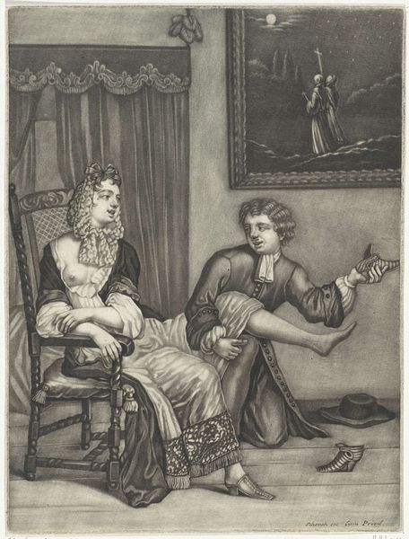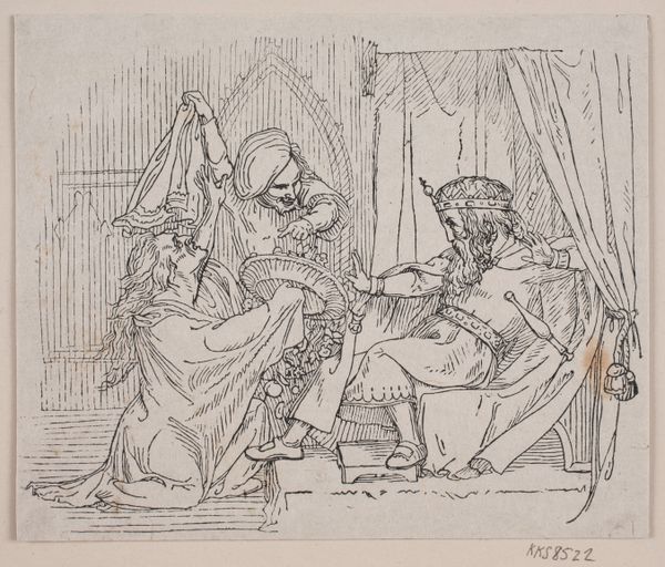 Editor: This is "Koning Midas met ezelsoren," or King Midas with donkey ears, a pen drawing from between 1802 and 1809 by Daniël Veelwaard, currently at the Rijksmuseum. It strikes me as a pretty bizarre scene, like a still from a strange play. What symbolic weight do you think is carried in these donkey ears? Curator: The donkey ears are paramount. Throughout history, across various cultures, the donkey has often symbolized foolishness, stubbornness, and a lack of refinement. Placing these ears on King Midas is no accident. Veelwaard is tapping into a deep well of cultural understanding about the dangers of pride and poor judgment. What's intriguing to me is the act of *bestowal*. Someone is literally pointing *at* those ears. Does that suggest something about public shame versus private failing? Editor: That's a good point – someone else is pointing them out. Is this artwork perhaps suggesting something about the relationship between power and public perception? Curator: Precisely. It implies that Midas's folly isn't just a personal failing but a visible symbol of his unsuitability to rule, revealed for all to see. Notice how Veelwaard depicts the figures. Is this perhaps more aligned with comedic character design and farce than with classicism and traditional symbolism? Editor: Yes, they are quite cartoonish, but now I see how even in caricature, the visual cues pull from a shared understanding of what those symbols represent. Curator: Exactly! Even in a comedic, romantic drawing, those loaded symbols retain their power and contribute to our understanding of human nature, which is also on display here. A humorous representation that taps into familiar narratives and cultural understandings. Editor: That makes the artwork richer in my perception!