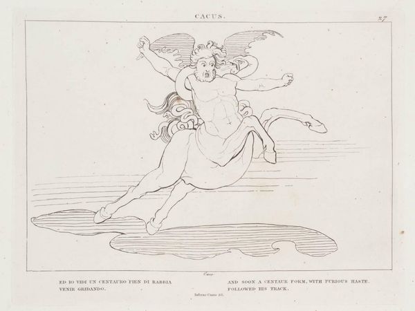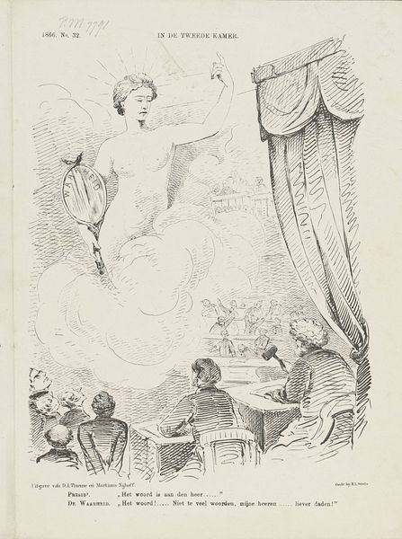 In 1865, Johan Michaël Schmidt Crans created this print, "Spotprent op de opvolging binnen de Antirevolutionaire Partij," using etching techniques to capture a political moment. Notice how the composition is structured to create a dynamic, almost theatrical space. Figures in classical drapery gesture dramatically amidst a somewhat blurred landscape with a prominent horse hovering above, seemingly suspended in mid-air. Crans uses line and form to stage a scene which is both absurd and pointed, destabilizing the gravitas typically associated with political succession. The loose, expressive lines lend a sense of immediacy, while the stark contrast between light and shadow draws attention to the caricatured figures. The horse can be seen as a symbolic representation of power or perhaps disruption, while the figures serve as semiotic markers of political actors. The image challenges established notions of authority and decorum. The piece's formal qualities contribute to its critical message, using visual language to dissect the political climate of the time. It reminds us that art often serves as a forum for questioning and reinterpreting social norms, challenging viewers to reconsider accepted truths.