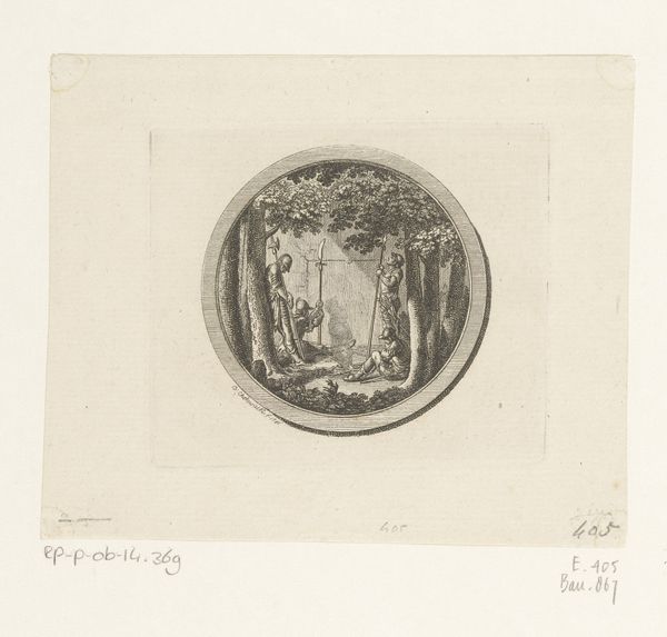 Editor: This is *Allegorie op de dood van Johann Kaspar Lavater*, created between 1801 and 1807 by Jacob Merz. It’s an ink and watercolor print, held at the Rijksmuseum. It feels very neoclassical to me – quite somber and elegant. What symbols do you recognize here, and what might they represent in this context? Curator: Indeed, the somber elegance speaks volumes. Consider the urn: its shape evokes classical antiquity, a time often associated with ideals of beauty and order, but here it explicitly marks loss. And the putti...observe how they seem burdened, wings drooping. What emotional state do their postures suggest? Editor: Sadness, definitely. They’re almost struggling to hold up the garland. Curator: Exactly! That garland, usually a symbol of celebration and honor, becomes heavy with grief. Notice the "L" inscribed on the urn. What significance might that initial hold? Could it be a reference to Lavater himself? Editor: That makes sense! And the crossed quills behind the urn – perhaps alluding to his writings? Curator: Precisely. Symbols layer upon symbols, constructing a portrait of Lavater's life and legacy, filtered through the universal experience of mourning. Do you feel that the artist is celebrating his life or mourning his loss, or a blend of both? Editor: It’s a delicate balance. The urn is a clear symbol of death, but the garland, even weighed down, still speaks to remembrance and perhaps even the enduring quality of his work. It is thought provoking. Curator: The cultural memory encoded within these images shapes how we remember and process loss, linking us to generations past who found meaning in similar symbols. Perhaps even offering a visual language to understand death and dying. Editor: I hadn't thought about how consistently symbols appear over time! This has given me a richer appreciation of its historical and cultural importance.