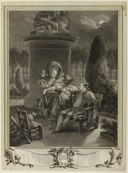 Curator: Here we have an ink drawing on paper from Johannes Alexander Rudolf Best, dating between 1807 and 1855. Its title translates to "Father with two boys in his arms and mother, sitting in garden by two dogs." What are your immediate impressions? Editor: Well, the most striking thing is the almost saccharine domesticity. It presents a picture of idyllic family life, with very clean lines and an incredibly still, posed arrangement. Almost too perfect. Curator: It is fascinating how the artist uses the conventions of Romanticism to depict bourgeois domesticity. The positioning of the father as the central figure, cradling the boys, speaks to notions of paternal authority and emotional connection. The mother, while present, occupies a more passive role. We must consider how such a depiction reinforces prevailing gender norms of the time. Editor: Indeed. The formal composition also interests me. Note how the artist has grouped the figures centrally, framed by the trees and architectural detail of the home behind. It creates a sense of enclosure and self-containment, further reinforcing the idea of the family as a distinct, protected unit. I wonder what semiotic readings one might have for the repeated appearance of canines in similar period works... Curator: Through an intersectional lens, one can analyze the visual representation of class in this piece. The well-dressed family, the manicured garden, and even the presence of dogs as pets, signals a certain level of privilege and economic standing. This is not simply a portrayal of familial love, but also a subtle display of social status and bourgeois ideals. Editor: Absolutely. The execution of the work seems rather skillful in modulating line and tone with such restricted palette, drawing one's eyes towards the interiority of the image despite its simple narrative scene. Do you find it to have succeeded in expressing any particular emotional nuance through those aesthetic decisions? Curator: The drawing underscores the socio-political constructs embedded within the family unit during the early 19th century. Its idealized vision serves to naturalize power structures and gender roles. It’s also an intimate depiction, offering glimpses into personal lives and aspirations during a pivotal era. Editor: Indeed, and I find my attention shifting again toward the dogs – creatures bound to both labor and leisure in that period. Each compositional choice tells an intriguing piece of a story, with technique being as equally a factor of import as content matter itself. Curator: A pertinent observation to keep with us when reflecting on similar drawings of that era.