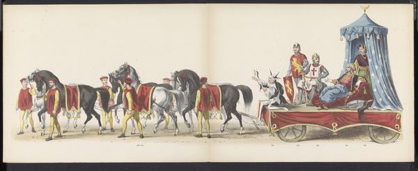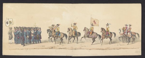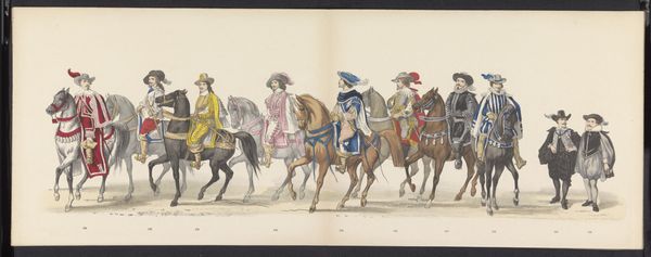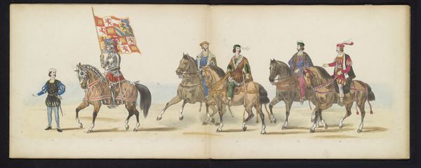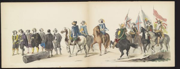 Gerardus Johannes Bos created this watercolor print titled 'Masquerade of the Leiden Students' in 1855. It depicts a parade of students in historical costumes, mounted on horseback, an illustration of the grand masquerade held during the third centenary of Leiden University. Leiden University, a Dutch institution, played a crucial role in shaping the nation's intellectual and political landscape. It was a training ground for the Dutch elite and a hub of progressive thought. This image provides insight into the university's self-image, celebrating its history and traditions through elaborate displays. By dressing in historical costumes, the students connect themselves to a grand narrative of Dutch history and learning. The print's visual codes also point to the social dynamics within the university. The costumes and the act of parading itself reflect the social hierarchies and the performance of identity that were central to student life. Art historians can use archives and university records to explore how these masquerades were organized, who participated, and the broader significance of these events within the university's culture. The art is contingent on its social and institutional context.