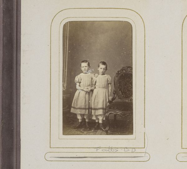 Curator:This is "Portret van een zittende vrouw en een staande vrouw" or "Portrait of a Seated Woman and a Standing Woman," taken sometime between 1871 and 1893 by Ed. Radermacher, captured through the medium of photography. The composition and monochrome tones lend a certain gravity to the sitters. What do you make of it? Editor: I find the texture really interesting; it feels heavy with fabric and details. What stands out to you from a formal perspective? Curator: Notice how the photograph’s geometry structures our viewing. Vertical and horizontal lines dominate – the door behind, the mantle, the women’s dresses. How do these visual choices direct our eyes? Editor: I see what you mean. The verticals really compartmentalize the space. Do you think this contributes to the rigidity in their poses? Curator: Precisely! The sitters are strategically placed; the standing woman partially obscures the background with her velvet dress and dark features that merge with the ornamented mantle. Do you find their gazes significant? Editor: They both stare straight ahead with direct eye contact which feels formal, even confrontational. Perhaps it contributes to this portrait's success through composition? Curator: Indeed, through careful orchestration of line, form, and pose, Radermacher crafts an experience – not just a picture. Understanding formal qualities can enrich any viewer's insight to art. Editor: It has definitely provided a new depth to how I interpret the historical, cultural, and sociological elements within this portrait. Thank you.