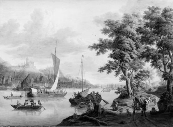 Curator: Here we have an artwork entitled "Seascape with Ships, a Forest and a Tower," crafted in 1848 by an anonymous artist. It is rendered in monochrome, using oil paint on canvas. What are your initial thoughts? Editor: Immediately, I notice the composition. There’s this interesting balance between the meticulously detailed foreground with the figures and the tower, versus the hazy, almost dreamlike quality of the sea and sky in the background. It evokes a sense of being on the threshold of something. Curator: I’m drawn to the textures. Notice how the artist meticulously layers paint to define the rough, weathered surface of the tower, contrasting sharply with the smoother rendering of the sails on the distant ships. What materials were locally available and the labor involved in acquiring them at this time? The logistics behind creating this scene interest me most. Editor: Absolutely. And thinking about context, what power dynamics are at play here? These ships on the water represent so much about trade, colonialism, the movement of people, willing or unwilling, and exploitation of resources. We see people on the shore, in what appear to be subjugated roles in labor or movement; these black and white tones obscure that, removing race and social hierarchy while paradoxically bringing it into sharp focus. Curator: Agreed, the use of monochrome seems to neutralize any specific narrative, prompting questions regarding the painting’s function: what narratives, traditions, or even economic exchanges did the artist hope to conjure for the canvas itself, the paint, or the ships? What resources did these things cost to procure? Editor: Exactly. Was the artist seeking a broader meditation on historical themes or simply portraying an idealized moment in time that served a political message, or both? The details—the clothing, the architecture—point to specific cultural encounters and the legacy of interactions of vastly different scales of people traveling by water and land. We need to also see where the work has been exhibited. To whom was it presented and when, how and by whom has this been maintained? These questions shape how we understand the work. Curator: I appreciate your perspective. Seeing it through this particular lens reveals so much. Thank you! Editor: Thanks to your highlighting material processes, my social and political analysis can land on very real economic struggles!