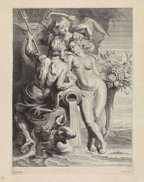 Curator: Welcome to the Rijksmuseum. Today, we’re exploring a striking engraving entitled “Beeldengroep van Venus, Amor en een sater,” dating back to 1574, created by an anonymous artist. Editor: Woah! It's got a theatrical sort of intensity, right? All this raw physicality, the textures… It almost feels like looking into someone’s dream…or maybe their anxieties? Curator: The composition is quite remarkable. Observe the positioning of Venus reclining languidly, Cupid mischievously aiming his arrow, and the satyr looming powerfully in the background. The lines, rendered through engraving, contribute significantly to the overall form and spatial depth. Editor: Totally, and there’s a sense of...discomfort? Venus doesn’t look exactly thrilled. Cupid seems more impish than loving, and the satyr feels intrusive. I wonder, is it a story of mismatched desires? Of love being more complicated, darker even, than we typically acknowledge? Curator: It’s plausible to interpret the artwork as an exploration of contrasting forces. The sensuality of Venus is juxtaposed against the bestial nature of the satyr. Furthermore, it’s critical to examine the interplay between the nude form and its representation through carefully delineated lines. Editor: Absolutely! Plus, there is a power dynamic! The woman exposed. Cupid acting as instigator of it, the satyr's leering presence...It could represent ideas of desire or of violation or something really fascinating happening. And those little flourishes and the old school inscription gives you the feeling that there are hidden narratives at play too, right? Curator: The engraving technique here, typical for the era, allows for extremely fine detailing which helps create texture on skin, muscle and fur of the satyr! These contrasts in texture, as well as light and shadow add emotional power to the narrative. Editor: What really gets me are all the mixed signals it’s throwing. Beauty, danger, innocence, lust… it’s all churning together in one captivating scene. It has definitely opened some thinking and maybe even re-evaluating the nature of passion and love, at least it does for me! Curator: A compelling conclusion, Indeed. This engraving stands as an artifact reflecting both artistic skill, and thematic richness inherent in artmaking throughout history.