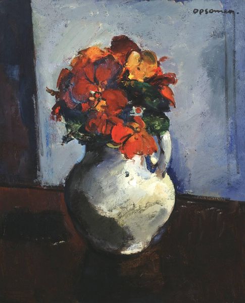 Editor: This is Lovis Corinth's "Chrysanthemen Und Rosen Im Krug," painted in 1917. The impasto is so thick; you can really see the texture of the oil paint. It's a really vigorous, almost brutal application of material, which contradicts the gentle subject matter. What stands out to you about this piece? Curator: Well, immediately, I'm struck by the material reality of war-time scarcity during World War I. Consider the availability, the labor, and even the expense involved in acquiring the paint itself. These materials weren't neutral; their presence speaks volumes about class and access amidst societal hardship. Editor: So, you're saying the flowers themselves are less important than the story the materials tell? Curator: Not entirely. Corinth, known for his expressive brushwork, seemingly revels in the sheer physicality of applying the paint. The clashing pinks and purples, fighting for space on the canvas – isn’t there a reflection of social discord in this struggle? Editor: That makes me see it differently. Before, the brushstrokes seemed emotional, but maybe they also speak to the practical challenges Corinth faced, and maybe he wanted to capture these sentiments. Curator: Exactly! What about the vase itself? It’s an everyday object elevated by the artist's touch. The transition from mundane item to art object requires that it be recontextualized, making it something new. Editor: That really opens up my understanding of Expressionism in general, focusing on the raw, material elements and their relationship to historical and social forces. Thank you. Curator: Indeed, examining the materials, production and even the consumption around art encourages a richer, and dare I say more honest interpretation of Corinth's vision.