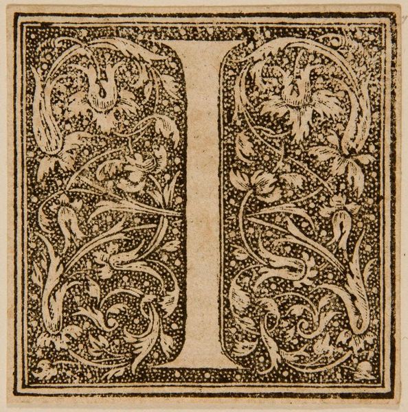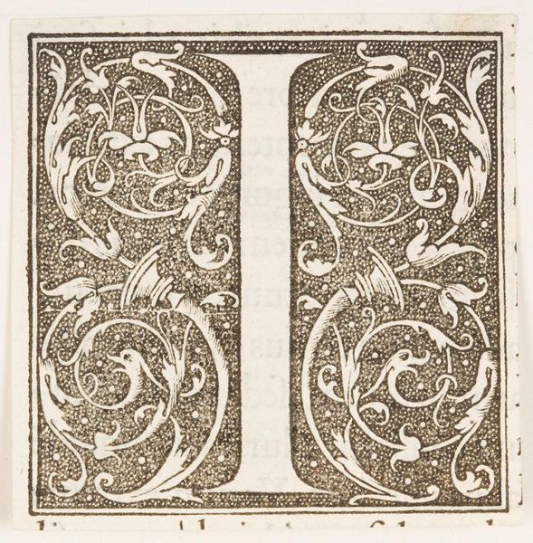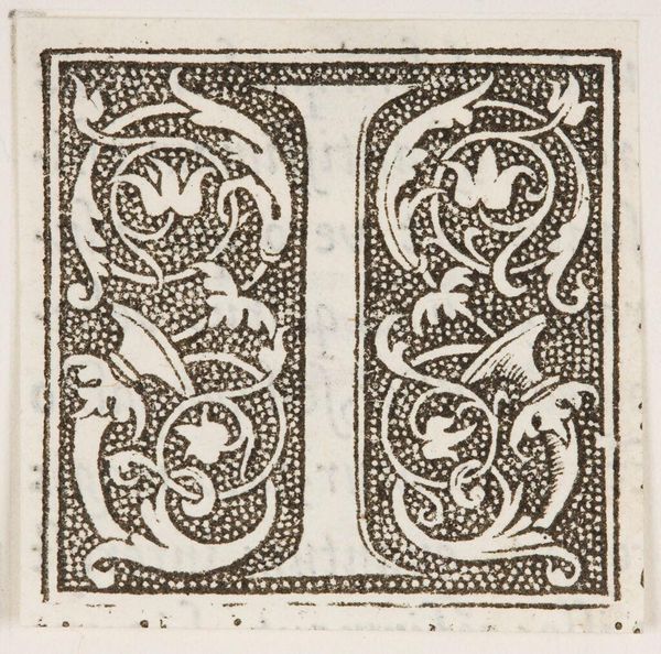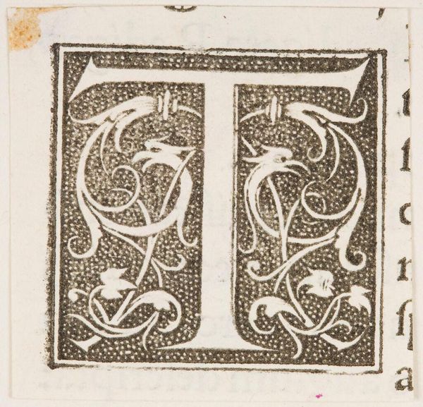 Editor: Here we have an initial for "Letter T," created by an anonymous artist. Its intricate design is quite striking. What do you see in this piece? Curator: The stark contrast between the black stippled ground and the white letterform immediately establishes a visual tension. Note how the foliate designs intertwine with the letter, blurring the boundary between the symbolic and the decorative. Editor: It’s interesting how the faces emerge from the foliage. Curator: Precisely. These Janus-like figures, with their enigmatic expressions, complicate our reading of the initial. Are they merely ornamental, or do they suggest a deeper narrative? Consider how the artist uses line and texture to create depth and volume, drawing the eye into a world of symbolic forms. Editor: It's given me a new appreciation for the artist's technique. Curator: Indeed, and encourages us to consider the letterform not just as a signifier, but as a complex visual composition in its own right.