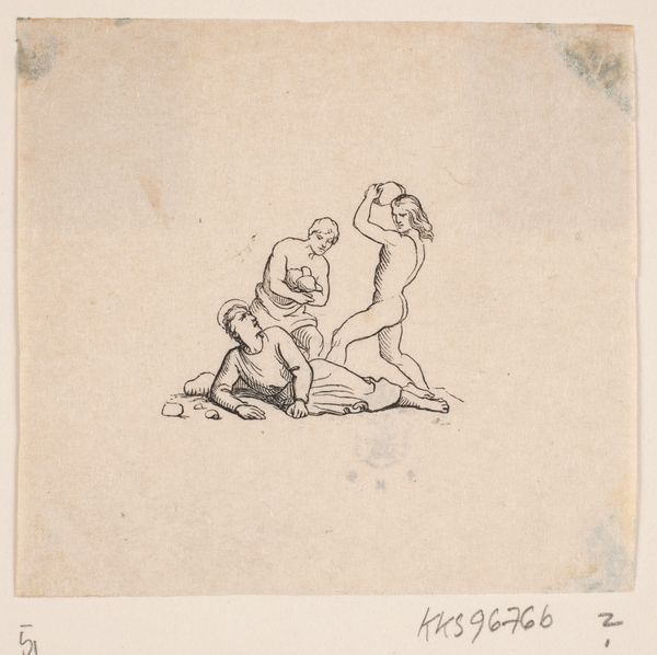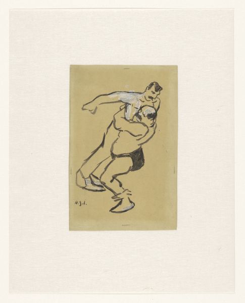 Editor: So here we have Henri-Gabriel Ibels’ "Kneeling and a Crouching Wrestler," dating roughly from 1877 to 1936. It's an ink drawing on paper. I’m struck by its raw energy, you can almost feel the physical strain and the drama. What do you make of it? Curator: Oh, this one hums with a certain intensity, doesn't it? It makes me think about how Ibels zeroes in on capturing the essence of movement. It's like a snapshot, capturing an incredibly fleeting moment – that point where balance hangs by a thread and victory could swing either way. What do you think he wanted to communicate? Editor: Possibly, the sheer strength and dynamism of the human form? The composition certainly pushes the eye right into the thick of the action. Curator: Absolutely! And look how economical his lines are. Each one seems to vibrate with energy, defining muscles and contorted bodies with almost brutal directness. I get a feeling, too, of a real fascination with bodies pushed to their limits, something almost primal. Tell me, does that rawness remind you of anything? Editor: I see some echoes of Japanese prints – maybe in the flat perspective and emphasis on line? Curator: Interesting! The contours do show some stylistic links to Ukiyo-e prints from the time. It really showcases how artists absorbed influences, didn't it? What an invigorating conversation; it feels like this drawing has really made us flex our intellectual muscles. Editor: It really has. I’ll certainly look at Ibels’ work differently now.