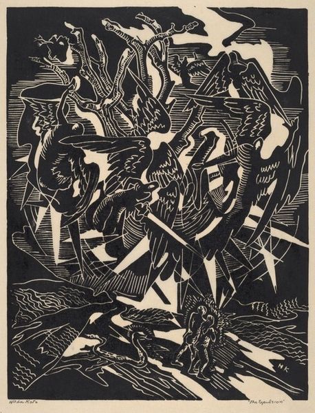 Editor: So, here we have "The Bridge" by Otto Kisling, made with a woodcut print. It has this powerful, almost harsh feel with the stark contrast of black and white. How do you read into the expressionistic rendering, its significance, given the themes prevalent in the art world at the time? Curator: It's fascinating, isn't it? The Expressionists were deeply engaged with the political and social upheavals of their time. Kisling, part of that movement, uses this woodcut to not just depict a landscape but to convey a sense of unease, of fragmentation. The bridge, literally a connector, appears almost… fractured, inaccessible. What social or historical realities might be influencing that artistic decision? Editor: Perhaps the fracturing reflects a breakdown of social cohesion in a time of war and social unrest? The figure seems isolated despite being in this active landscape. Curator: Precisely. And think about who has access to bridges, both literally and metaphorically. Consider how access, mobility, and connection – or the lack thereof – played out along lines of class, gender, and race in Kisling's time. Can you see reflections of those power dynamics embedded in the work's visual language? Editor: I think so. The sharp angles and stark contrast seem to represent the social struggles. It almost feels like the figure is barred from fully engaging with this disrupted world. Curator: Right. And that invites us to consider who is systematically excluded or marginalized and how their experiences might parallel or diverge from the figure in this artwork. The power of art lies in its ability to become a touchstone, a conversation starter about those broader social dynamics, don't you agree? Editor: Definitely. I hadn't thought about the accessibility of a bridge beyond the obvious. It’s interesting how looking at the power dynamics really deepens our understanding of art and the world.