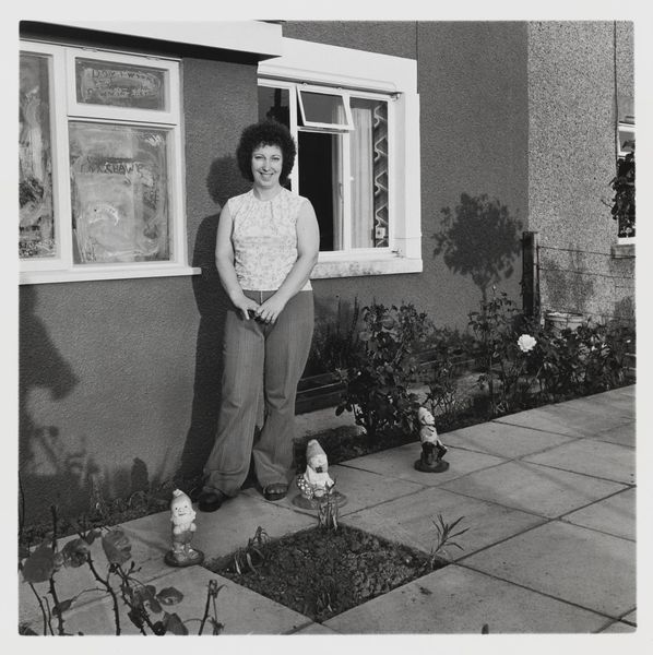 Editor: Keith Arnatt's black and white photograph, "Gardeners," presents a very staged scene. There's something about the composition that feels very deliberate. What do you make of it? Curator: The strict grid formed by the brickwork and paving stones contrasts sharply with the organic forms of the plants and the figure. Note how the artist has positioned the woman, central yet almost blending into the background. Editor: Blending in? She seems quite prominent to me. Curator: Consider the tonal range. The light reflects similarly off the wall and her clothing, creating a visual echo. The geometric versus the organic is a dialectic, an interplay, further emphasized by light and shadow. Editor: That's interesting. So it's less about the gardener and more about the visual relationships? Curator: Precisely. Arnatt directs our attention to the formal elements, prompting us to decode their symbolic significance. Editor: I hadn't considered it that way. I appreciate the new perspective on the formal relationships at play.