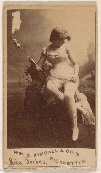 Editor: This is “Lady Alphonsene, from the Actresses series,” printed around 1889 by Wm. S. Kimball & Co. It feels very much of its time—an actress depicted with a certain...dreamy softness. What visual cues speak most strongly to you? Curator: Immediately, I see the accoutrements of the stage—the elaborate costume, the classical balustrade—they construct a potent symbol of theatrical artifice and female display. But consider the "cigarette card" format; it invites questions about accessibility, celebrity, and cultural values attached to performance. Do you notice how her gaze engages the viewer directly? Editor: Yes, there's a confidence there, despite the somewhat faded quality of the print. It makes me wonder what being an actress signified at that time. Curator: Precisely. The image participates in shaping the *idea* of the actress. The stars on her bodice might be read as an iconographic connection with the celestial, suggesting divine talent or public adoration. Conversely, how does it potentially reduce her to a commodity? Cigarettes were highly advertised—how might that context change the perception of Lady Alphonsene? Editor: That's a fascinating contrast to consider: elevated yet commodified. The small format suggests disposability, almost the opposite of the fame one might expect. Curator: It does, doesn't it? Think about the Victorian fascination with collecting. The card transforms her into a collectible object, a captured image disseminated widely. But the real woman, the real artistry, become ghosts within the symbol. Editor: I’m starting to see it now – how layers of meaning are embedded within the context of a seemingly simple portrait. Curator: Absolutely. It makes me reflect on how seemingly fleeting images continue to communicate cultural anxieties, aspirations, and our relationship to spectacle itself. Editor: This look behind the curtain reveals the depth beneath the surface. Thanks for illuminating it!
