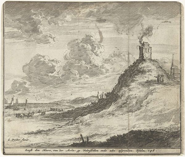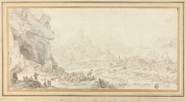 Curator: Willem Schellinks, likely sometime between 1637 and 1678, gifted us this drawing, "Italian Landscape," now held at the Rijksmuseum. What do you think? Editor: There is something haunting about this piece; the monochromatic greyscale renders everything into a dreamlike memory. Curator: Dreamlike is an interesting word here, considering the interplay between form and its delicate rendering through ink and pencil. Look at the strategic placement of the figures in relation to the landscape. Does that register? Editor: Absolutely. We see a detailed foreground depicting figures—likely workers—but they almost melt into the landscape rather than dominating it, inviting conversations around labor, landscape and power dynamics of the Dutch Golden Age. How do their lives compare to our contemporary precarity? Curator: Their arrangement directs the gaze towards the cityscape in the distance, carefully establishing a visual hierarchy. Note how the architecture provides points and anchors. Editor: Points and anchors yes, but consider who occupied those architectures? Power circulates visually but it is more than a composition trick, it shows that urban centres of power always rely on precarious labor forces working outside the periphery. How can the visual language prompt us to explore issues like class disparity that persist today? Curator: Undoubtedly, that is relevant; though I am intrigued by the stark tonal contrast achieved with minimal medium—creating depth where you sense a vast, sunny vista typical of idealized Italian settings. Editor: While I agree about its artistry, idealization needs interrogating. By focusing solely on aesthetics, do we risk ignoring the socio-political undertones? The very concept of an 'ideal' often excludes many voices, which calls attention to whose gaze informed this Dutch Golden Age vision. Curator: I see how the composition provokes these contextual analyses and lived questions and meanings. A pencil and ink drawing can hold such space for broad contemporary conversations! Editor: Precisely! That's what makes pieces like Schellinks’ landscape relevant and resilient – its invitation for discourse, and how each viewing reshapes the relationship to the world surrounding us, still.