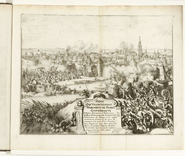 Curator: Well, what strikes me first is how dynamic it all is! It feels like one of those intricate dreams where you're running but not really going anywhere, you know? Editor: Precisely. And while seemingly chaotic, this is "Inname van Lagny, 1589-1590" by Romeyn de Hooghe, a Dutch artist and engraver working in the late 17th century, now housed at the Rijksmuseum. What we are observing is the depiction of the siege of Lagny during the French Wars of Religion. It's a print, specifically an engraving, that masterfully captures the intensity of warfare. The date the engraving was created, sometime between 1670-1699, is worth noting. Curator: It's teeming with tiny figures, like ants on a battlefield! The composition almost bursts with energy. You've got plumes of smoke, frantic activity...but do you get the sense that the details are...sort of stylized? Like theatre, not entirely real? Editor: That tension between reality and performance is vital to grasping Baroque art's ethos. It served both as propaganda and historical documentation, and De Hooghe often took liberties with realism to enhance the narrative or promote a specific viewpoint. Curator: Right, there's the social dimension of it. And it's not just battle either, there's also this...almost celebratory mood, like it is celebrating the victory that history teaches us had its grey areas. Editor: Exactly, it's crucial to analyze these prints within the framework of their production: exploring patronage, political motivations, and the power structures influencing what and how history was visualized. Whose story gets told, and how? The composition may draw your eyes, but who is actually centered here? Curator: So true! It is a whole swirling clash of action, but perhaps deceptively so. It leaves you thinking, reflecting about how wars have been celebrated over the ages. Editor: Indeed, this work invites us to consider how images, even those seemingly distant from our present, continue to shape our understanding of the past. And also perhaps more crucially to interrogate the role they play in contemporary identity formation. Curator: That's it then, a layered experience it is, and also one with echoes in our own lives! Editor: Undoubtedly, history constantly invites dialogue, so keep questioning, keep exploring!