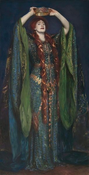 Curator: Terri Kelly Moyers created "Flamboyance" in 2017. What strikes you most when you first see it? Editor: There's an undeniable strength and self-possession radiating from the subject, but also a quiet dignity. I’m curious about the context of her pose, her gaze, and particularly her clothing. Curator: It’s a striking study in textures and cultural symbols. Look closely at the interplay between the crocheted shawl, the embroidered blouse, the black lace overskirt… There's an emphasis on skilled handwork. Consider the time and labor embedded in these textiles! Editor: Yes, the textiles tell a story. The shawl could represent inherited tradition or perhaps even acts of resistance to cultural assimilation. The embellishments, what does her self-presentation signal in the context of contemporary portraiture, which has often marginalized or exoticized Indigenous subjects? Curator: I think Moyers is keenly aware of this history, offering a counter-narrative through the material choices. The layering of garments speaks to the complexities of identity, defying simple categorization. Her stance also communicates pride in her choices. Editor: I agree, this feels like a deliberate act of self-definition. Think of how often Indigenous people have been forced to shed their cultural garments and identities. This portrait claims agency, reclaiming and celebrating heritage on her own terms. Is "Flamboyance" perhaps less about vanity, and more about a defiant celebration? Curator: Interesting. This painting offers an important contribution to conversations around portraiture as a vehicle for reclaiming Indigenous representation and narrative control. What stays with me is how Moyers, through deliberate, skilled painting, honors this complexity and quiet strength. Editor: Absolutely, a potent reminder of art’s capacity to push for more respectful, multifaceted visual depictions of identity. I'm now left thinking about what "flamboyance" truly signifies. Is it merely ornamentation, or can it serve as armor?