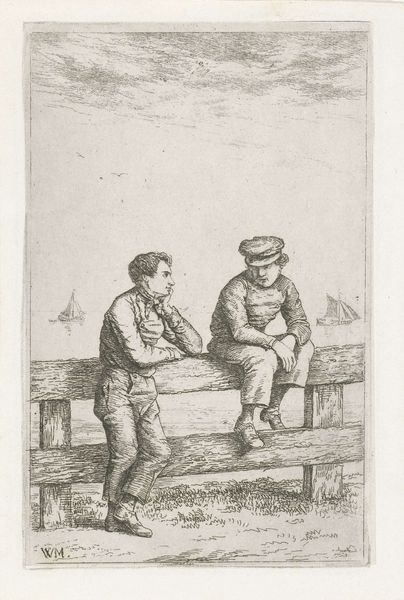 Curator: Here we have Christiaan Wilhelmus Moorrees' drawing, "De jongens bij de leuning", which translates to "The Boys at the Railing," created sometime between 1811 and 1867. It’s a wonderful little glimpse into a past world, isn’t it? Editor: It’s charming. My immediate impression is one of quiet observation. The boys seem caught between childhood adventures and the cusp of something more... something melancholic almost. Curator: Interesting that you say melancholic. I'm more struck by the pure observational skill at play. Look how he’s captured the casual pose of the figure leaning against the railing—the slight slouch, the hand propping up the chin. It's informal and intimate, like a stolen moment from a genre painting. Editor: True, there’s a delightful authenticity in their stances. From a formal perspective, the lines themselves are fascinating. Notice how the horizontal lines of the railing anchor the composition, while the subtle diagonal strokes suggesting the water and sky create a sense of depth and openness. It’s a rather ingenious balance of constraint and liberation, wouldn’t you agree? Curator: Absolutely! And yet, to me, this pencil sketch feels so much more than a technical exercise. I see these boys and wonder about their lives, their dreams…what stories would they tell if they could step off that paper railing? You know, was this perhaps part of his personal sketchbook, or was it conceived as an idea generation sketch, perhaps? Editor: Speculating is tempting! We should acknowledge Moorrees masterful interplay of light and shadow. Notice how the light pencil work doesn't merely define forms, but shapes the atmosphere—emphasizing the reflective mood. He has managed to distill essence! Curator: What a way to capture these characters! Thanks to its sensitive capture and gentle medium, the drawing just breathes possibility and subtle reflection, despite the medium's simplicity. Editor: Indeed, an artful simplicity. It’s almost like Moorrees invites us to write our own narratives into the silence of that scene.