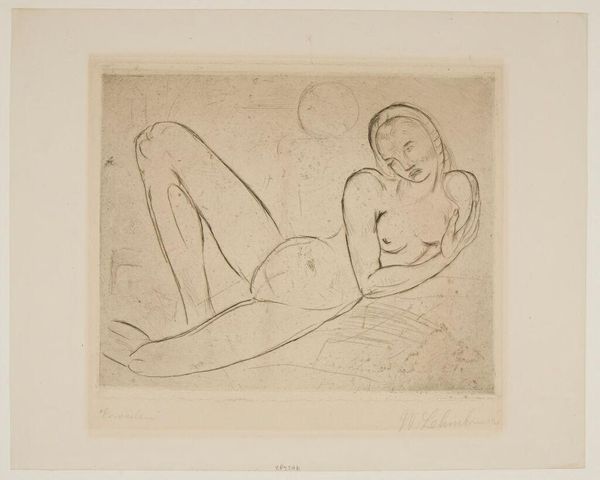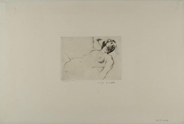 Editor: Here we have Emil Orlik’s "Nude Reclining Woman." It's a small print, almost intimate. What social narratives might this image engage with, given its display in a public institution like the Harvard Art Museums? Curator: Consider the history of the nude in art, often a symbol of power, beauty, or vulnerability, but seen through a male gaze. How does a museum mediate that history by displaying it, and whose perspectives are prioritized? Is it a celebration of the human form, or a perpetuation of societal norms? Editor: So the museum's role isn't just about preserving art but also about framing its meaning? Curator: Precisely. Every display is a conscious choice, reflecting certain values and potentially obscuring others. We need to critically examine whose voices are amplified and whose are silenced by these choices. Editor: I hadn't considered that aspect. It really shifts how I see the artwork and its place in the museum.