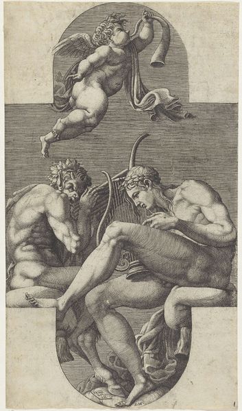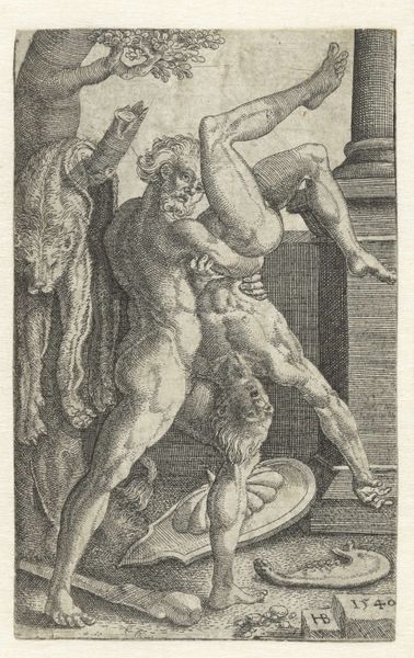 Curator: This image, residing in the Harvard Art Museums, captures the Laocoön in a Niche, engraved by Nicolas Beatrizet the Younger. Editor: The sheer agony is palpable, isn't it? The contorted bodies, the struggle... it’s overwhelming. Curator: Beatrizet’s print translates the monumental sculpture into a reproducible format, impacting its distribution and reception. Consider the labor involved in the engraving process itself, the meticulous carving into the plate… Editor: And the story it tells! Laocoön, the Trojan priest who warned against the Trojan Horse, punished by the gods. It's about power, dissent, and the silencing of truth. The snakes are symbols of divine retribution but also the crushing weight of systemic oppression. Curator: Right, but let's also appreciate Beatrizet's mastery. He renders the texture of skin and the tension of muscle through intricate line work. The paper itself, the ink...these materials carry their own history of production and trade. Editor: Absolutely, and the image, disseminated widely, fueled debates about artistic style and the burdens of knowledge. It’s a potent symbol of the individual versus fate, resonant even now. Curator: Indeed. I'm struck again by the skill required to create such an image, by the physical work and the dissemination of knowledge that followed. Editor: I agree, and it's a sobering reminder of how power silences those who dare to speak out against injustice.