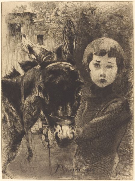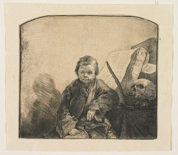 Editor: This is "The Little Philosopher," a 1778 etching by Jean-Pierre Norblin de la Gourdaine, housed at the Art Institute of Chicago. It’s surprisingly melancholic. I mean, a child next to a skull? It feels…heavy. What am I missing here? How do you interpret this work? Curator: Ah, yes, a weighty piece indeed. The "little philosopher," isn't he something? Norblin, with his etching needle, captured a very specific moment. Look at the *memento mori* symbols – the skull, the crumbling scroll, the darkness creeping around the edges – these aren't just decorative props, darling. They're a blunt whisper: Remember you must die. The child’s supposed wisdom is almost satirical – burdened with concepts no child should understand, don’t you think? He is the very portrait of innocence staring down the barrel of mortality. It’s terribly… poignant. Don’t you feel the dissonance? Editor: Definitely! The contrast is jarring. This boy's supposed to be a "philosopher," grappling with big ideas, but he's still just a kid. That shadow in the back…is that significant, too? Curator: The shadow...hmm. Perhaps the specter of futures never realized, of wisdom eternally just beyond grasp. Maybe Norblin asks if philosophy robs us of childish wonder? It makes me consider what burdens society imposes upon children, eh? Editor: I hadn’t considered that interpretation before, about lost wonder. This wasn’t what I expected when I looked at it initially. I assumed it was a history painting or a straightforward portrait! Curator: Expectations are boring, aren't they? Good art always has another question to whisper. Always a fresh bloom ready to unravel. Editor: So true. Thanks for your insights! I definitely see so much more here now. Curator: Anytime, darling. Keep looking, keep questioning – it’s a philosopher's game, really, isn’t it?