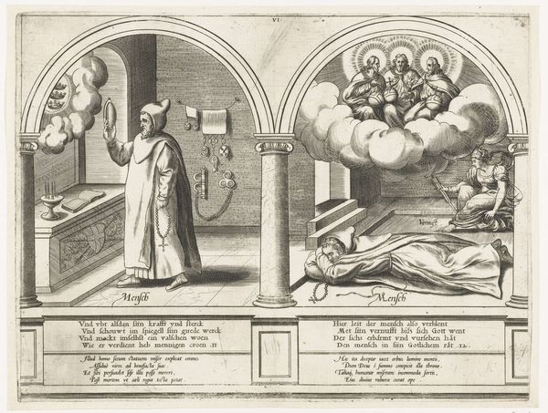 Curator: Frans Huys created this engraving, "Vernuft en de boetvaardige mens," sometime between 1546 and 1562. It currently resides in the Rijksmuseum. My initial assessment is of two separate realms joined as one. What do you notice? Editor: It feels stark and incredibly purposeful. The figures are etched with such precise, clean lines—almost clinical. But then the torch she's carrying is surrounded by radiant light! What are we meant to make of it? Curator: The engraving technique itself, the linear hatching and cross-hatching, contribute to this sense of starkness and control, typical of the Northern Renaissance printmaking. It speaks to the artist’s labor and intention in disseminating these allegorical concepts to a wider audience. It blends the tradition of allegory and also that of history-painting, at a very interesting transitional moment in terms of style. Editor: I can see the "history" element. The supplicant in prayer really draws the eye. Tell me more about that light! Is she offering that? Rejecting it? Curator: That's Vernuft or Ingenuity and there she stands on the cusp, almost blindfolded, stumbling perhaps over a prone figure while a man prays seeking divine favor. I read it as a statement about human reason and religious faith – their uneasy, perhaps inherently flawed, interaction. It's a statement about materials, and how through process such as this an idea comes to have a material effect. Editor: Uneasy, definitely. Maybe like that time I tried to build IKEA furniture after only reading half the instructions. Disaster! It is an invitation to look harder, but is this tension ultimately...hopeful? I hope so. Curator: Considering the labor-intensive and thoughtful approach typical of printmaking from this period, that kind of hope probably motivated Huys and certainly the buying audience. The distribution itself suggests as much. Thank you for sharing the thought! Editor: Thank you, that's fascinating. Makes you want to buy some glue sticks and learn how to do engraving yourself, no?