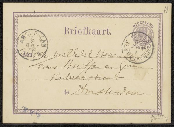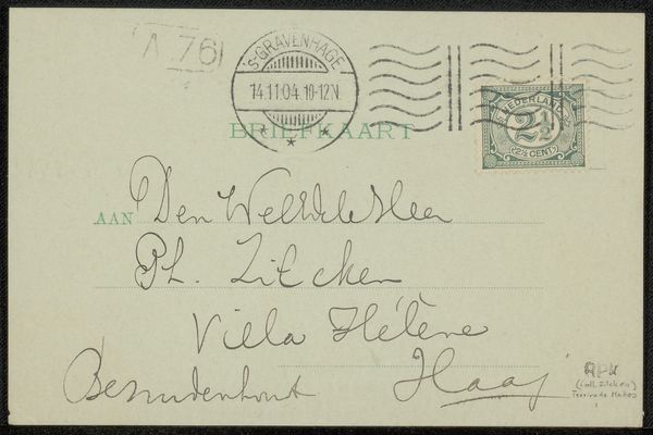 Curator: At first glance, I am struck by the ephemeral nature of this "Briefkaart aan Philip Zilcken." It whispers of fleeting correspondence and the beauty found in everyday communication. Editor: Indeed. From a historical perspective, it offers a fascinating glimpse into the social customs of the early 20th century, before 1926, when Barbara Elisabeth van Houten penned this note, employing ink on paper. The act of handwriting itself becomes a marker of a specific time and place. Curator: Absolutely, and the handwritten text becomes imbued with personality and intent. I’m drawn to the elegant flourishes and loops. It's like a script dance across the page, conveying emotion beyond the mere words themselves. It almost makes one long for the days of letter writing when communication wasn't so instant, impersonal and fleeting! Editor: The stamp in the top right and the postmarks as well offer a specific reading of that earlier time and society. What might seem like random elements today were part of the culture and shared imagery. Think about how much visual weight the physical markings of a letter like this one might carry for the intended receiver versus the digital ping of an email today. Curator: That's an astute observation. The visual language extends beyond calligraphy and evokes a bygone era. These postal markings root the image in lived reality and memory—personal memory as well as cultural. How curious to study this message intercepted along its postal route through time, stripped of its full message. Editor: Its preservation speaks to a fascination with intimism – those personal moments and private interactions. How were they understood, and what can they tell us now? Curator: It’s a quiet work but it resonates with enduring human connections and the power of handwritten language, offering insight to viewers on those more subtle human layers and gestures in even casual communications. Editor: Ultimately, it's a humble but profound testament to the ways we connect and communicate and how culture, time and place imprint onto these connections.