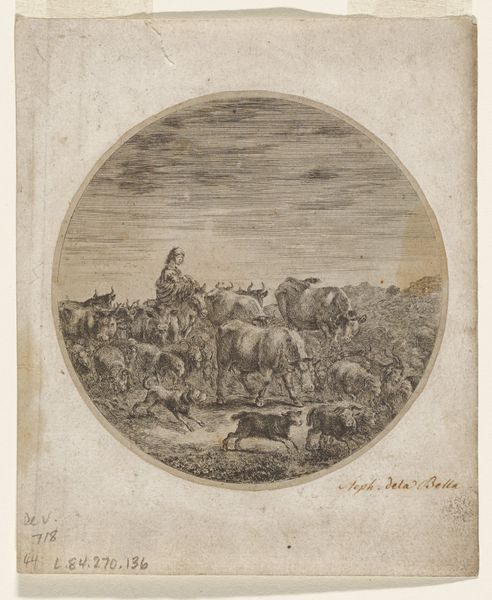 This etching, by Stefano della Bella, captures a pastoral scene using the fine lines achievable through metal plate engraving. Look closely, and you can see the intricate detailing of each animal's fur, and the folds in the peasant woman’s clothing. Della Bella was a master of printmaking, a process that allowed for the wide distribution of images. To create this print, he would have used a sharp tool called a burin to carve lines into a copper plate. Ink is then applied to the plate, and wiped off the surface, remaining only in the incised lines. The plate is then pressed onto paper, transferring the image. The choice of printmaking speaks to the evolving art market of the 17th century, and the growing interest in accessible art. The etching's subject matter, a scene of rural life, reflects a romanticized view of peasantry and agriculture. Yet, the very act of creating and distributing this image through printmaking is tied to the rise of commercial enterprise and the changing social landscape.