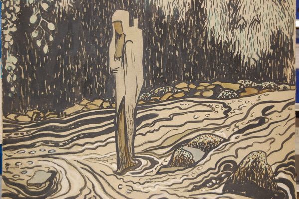 Curator: Ludwig von Hofmann's "Zwei Frauen und ein Jüngling im Bade," housed here at the Städel Museum, offers an intriguing glimpse into early modern ideals. We believe it was made with colored pencils on paper, though there's a slight ambiguity suggesting perhaps some oil pastel techniques at play too. Editor: Well, my first impression is one of quiet yearning. There’s a beautiful melancholy about the scene; the soft pastel colors lend it a dreamlike, almost ethereal quality. Are they figures from a myth or perhaps simply enjoying a clandestine moment? Curator: Hofmann moved in circles where these themes – nudes in nature, echoes of classical ideals – were actively re-imagined. This ties into the whole life reform movement prominent at the time, promoting healthier lifestyles and a return to nature as a remedy for industrial society. Editor: Exactly, but Hofmann doesn’t romanticize it. There's this pensive atmosphere, even unease, particularly in the standing figure draped in fabric on the left. It looks more like introspection, perhaps a sense of vulnerability exposed in the landscape. What’s your take on the arrangement of these characters, in terms of the visual storytelling here? Curator: Well, positioning figures in a non-theatrical but equally psychologically suggestive way, reminds me of a technique favoured by artists who belonged to the Intimist and Symbolist circles. Editor: It is such a gentle study of longing and humanity – that the Symbolist current you mentioned comes to mind is inevitable. But perhaps it has a quality specific to the time. What did Hofmann want us to reflect on as we watched? Curator: One interpretation is that, by showing figures in a natural setting, he's nudging the viewer to look at themselves, consider their relationship with the environment, and, perhaps more profoundly, reflect on life’s grander questions in a setting divorced from the increasing pressures of the modern age. Editor: Hofmann’s ability to distill such profound feelings into such delicate strokes makes this a special piece indeed. It’s less a representation and more a suggestion, prompting each of us to complete the story with our own vulnerabilities and longings. Curator: It serves as a testament to the power of art of that time and now to provide more than visual enjoyment but philosophical engagement too.