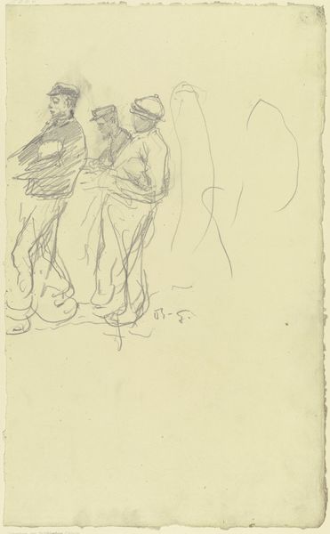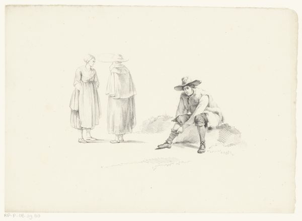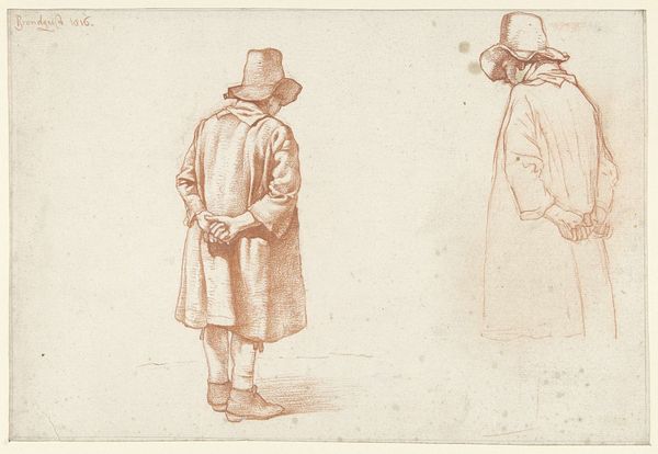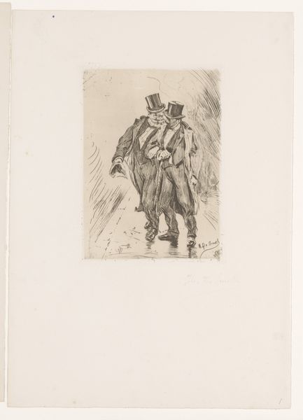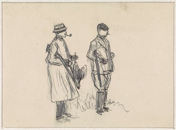 Wilhelm Marstrand made this drawing of two gentlemen in conversation using pen and brown ink on paper. It is a seemingly simple sketch, yet the material itself—ink on paper—speaks volumes about the time in which it was made. Consider that paper was becoming increasingly available during the 19th century, thanks to industrial production. And drawings like this were no longer just preparatory studies for paintings, but also a means of observing everyday life. Marstrand captures the attire of the bourgeois class. The high hats and tailored coats represent not just fashion, but social standing and economic power. The ease and fluidity of the ink lines suggest a quick study, a snapshot of a particular social milieu. This work blurs the line between documentation and art, using humble materials to convey the complex social dynamics of its time, inviting us to consider how even the simplest drawings can reflect broader societal trends.