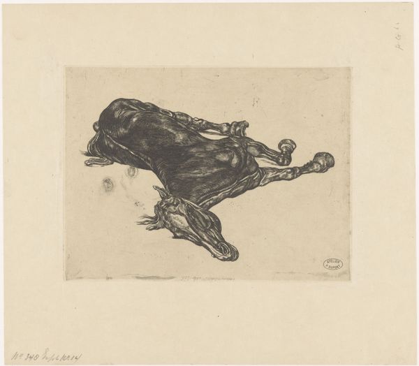 Curator: Goya's work, specifically from his "Disasters of War" series, consistently leaves me unsettled. Editor: In front of us is plate 40 from that very series, a print titled "He gets something out of it." Etched by Goya, likely between 1814 and 1863, it currently resides at the Art Institute of Chicago. There is something terribly unsettling about it, isn’t there? Curator: Horrifying, I would say. The stark contrast of the figures contorted in agony, caught in what seems to be their final moments. There’s a brutality in the simplicity, a visceral rawness that bypasses thought and goes straight to the gut. And this dark romanticism, too... what can you say of it? Editor: Absolutely. The pose screams sacrifice and desperation. Note the splayed limbs, the unnatural twist of the bodies. In terms of visual language, Goya brilliantly used shadow here. Light picks out the horror of it, while the darker areas hint at the unknown terrors lurking just beyond. We're witnessing not just death, but the psychological space of dread. Curator: You know, I read it almost as the person on the ground making one final offering from their corpse, while a man has crawled into frame to snatch what he can from it. A grim acceptance, perhaps? Maybe of being so poor or abused that even his final moment doesn’t belong to him. Editor: Possibly. Consider this—war strips everything back to basic instincts: survival, greed, desperation. That man crawling towards the body could represent those base impulses consuming humanity. But look closer – isn’t the phrase “he gets something out of it” also drenched in irony? It’s so easy to apply, given its broad ambiguity! Curator: Irony, indeed. It’s difficult to extract something beautiful or meaningful out of such depravity. A black sun is the best one could hope for. The etching process itself, with its harsh lines and acid bites, becomes a metaphor for the violence it depicts. Editor: And there you have it – romanticism reflecting upon itself through ruin, despair and dark dreams. A cultural memory permanently scarred into this piece. What is there to take away from this other than being left to face some terrible, timeless truth? Curator: A profound question for all who dare to dwell in this work! Goya forces us to confront the darker corners of human existence... even when we would rather not look.