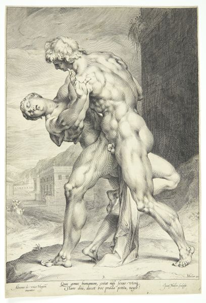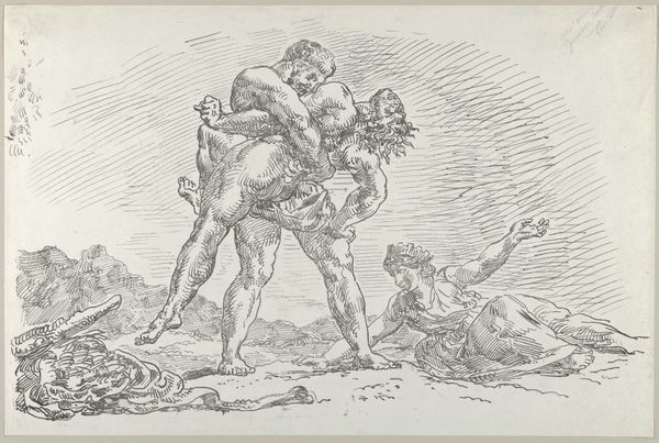 Auguste de Valmont's "Hercules Throwing Lichas into the Sea" captures a moment of wrath and power, rendered in ink on laid paper. The print depicts Hercules in a fit of rage, having just discovered Lichas’ deception. Hercules, a figure of masculine strength, stands triumphant over the Nemean lion. By contrast, Lichas is held aloft, his body limp. The stark contrast in their physical states speaks volumes about power dynamics, and the consequences of betrayal. Here we witness the embodiment of unchecked power, a theme resonant throughout history. How does Valmont's work invite us to reflect on the relationship between power, justice, and personal accountability? Consider the emotional impact of the image. Does it evoke feelings of admiration for Hercules, or does it provoke discomfort with his unrestrained rage? This print serves as a reminder of the timeless relevance of classical mythology and the continuing fascination with the darker aspects of human nature.