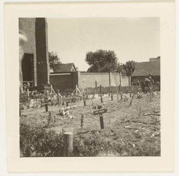 Editor: Here we have an unsettling image titled *Begraafplaats Duitse militairen,* or German Military Cemetery, likely taken between 1940 and 1946. It’s a gelatin silver print. What strikes me is the stark contrast between the neat rows of crosses and the ruined building looming in the background. What do you see in this photograph? Curator: I see layers of symbolic weight embedded within this seemingly simple landscape. Notice how the crosses, symbols of both faith and remembrance, are rendered almost identical, a visual flattening that speaks to the homogenization of grief and loss on a massive scale. The ruined building is key, a visual disruption—almost a negation of domestic space. It silently acknowledges destruction, situates the individual graves in a broader theatre of ruin. Editor: So, the building reinforces the context of war. What about the choice of subject? Why photograph a German cemetery? Curator: Consider the time, the aftermath of conflict. To photograph this space then is an act of witnessing, but also of complex reckoning. These crosses were meant to disappear behind rhetoric, demonization. The photograph reclaims that denied humanity, or rather, documents its erasure through death. The gelatin silver print as medium suggests documentary truth, yet its starkness also conveys trauma and alienation. Look at how the crosses almost visually ‘fight’ with those lighter blooms, and the lighter homes…the eye keeps being pushed back into the dark markers. Do you sense that push/pull too? Editor: I do. I hadn’t considered the almost confrontational nature of the photograph – how it challenges the viewer to reconcile those contradictions. Thank you. Curator: Indeed. It reminds us that images, like cultural memories, are never neutral.