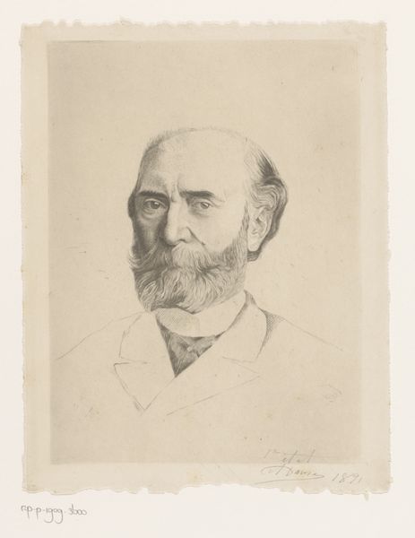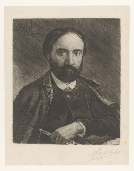 Charles Verlat created this self-portrait with an etching technique. The print employs a limited tonal range of blacks and whites. The composition is dominated by the artist's head and shoulders, emerging from a softly shaded background. Verlat uses hatching and cross-hatching to build up the density of the shadows, particularly noticeable in the beard and around the eyes, giving the face a strong sense of volume. His gaze is direct, almost confrontational. The lines that form his face seem to have a life of their own. The portrait challenges conventional portraiture by destabilizing the boundary between subject and medium. The artist’s identity is inseparable from the etching marks themselves. This etching blurs the line between representation and abstraction, highlighting the structural elements of artmaking.