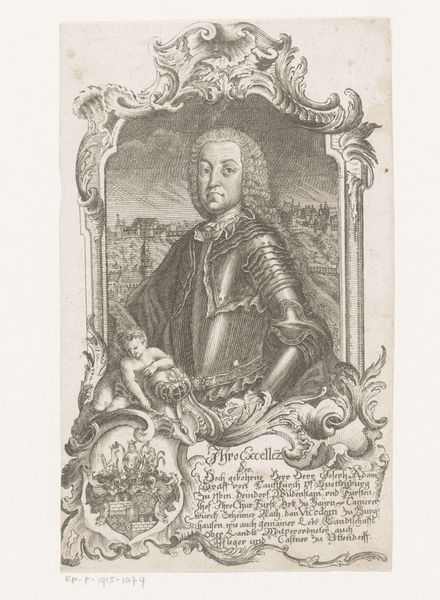 Curator: The work before us is a print identified as a portrait of John Stuart, dating between 1729 and 1802 and attributed to Franz Nikolaus Rolffsen. Editor: There's something rather stiff and formal about it, isn't there? The figure looks confined, almost as though imprisoned by his ornate garments and the architectural setting behind him. Curator: Portraits like this one functioned as symbols of power and status. The depiction of John Stuart draped in ermine and lace conveys a clear message about his position within the British aristocracy. This imagery was circulated through prints, reinforcing social hierarchies. Editor: Precisely, it's about visual coding! The ermine immediately signifies nobility and justice, while the specific type of lace often pointed to membership within a particular order or rank. It’s like a uniform that speaks volumes about identity and affiliation. He's even wearing a prominent belt with what seems to be a ceremonial buckle; symbols of both earthly power and some larger ideology. Curator: Indeed. What's also interesting here is that Rolffsen, though of German origin, seems to have catered to British tastes for formal portraiture, which at the time played an important role in defining the self-image of the nation’s ruling class. Disseminating images like this solidified John Stuart as part of a visual lineage of powerful individuals. Editor: The column backdrop is so interesting; it serves not merely as setting but rather as a grounding element for his entire image of status and respectability. And you know what I see when I study it a little closer, even though the technique is mostly linear... a vulnerability. Perhaps a quiet admittance of what burdens come along with wearing such heavy garments of responsibility. Curator: Perhaps we're also reading into the pose itself; it certainly lacks dynamism. Consider, however, the context: printmaking allowed for widespread reproduction. Prints became key in distributing political ideologies and reaffirming a sense of cultural identity, as portraits like these filtered into public and private collections, shaping historical memory. Editor: Looking closely, I am fascinated by how it conveys its message: not just about individual fame, but, more fascinatingly, as it reflects what we project onto such symbols and individuals. Curator: So, we witness here more than the likeness of John Stuart. Editor: Exactly.