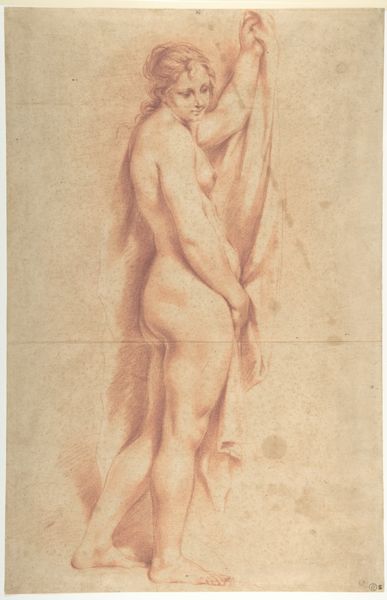 Domenico Maria Canuti created this drawing of a male herm in an unknown year using black and white chalk on paper. The figure's torso and raised arms command the composition, rendered in a range of grey tones that give volume to his muscular form. Canuti's drawing explores the interplay between form and representation. The artist uses line and shading to create a sense of depth and texture which defines the subject's physique. The upward reach of the arms suggests a dynamic tension. The body is idealized, yet the softness of the chalk lends a certain vulnerability to the figure. The sketch is a study in classical forms. It is also a site where tradition is re-imagined through the artist's expressive handling of the medium. This herm is not just a depiction of the male form but an exploration of artistic potential.