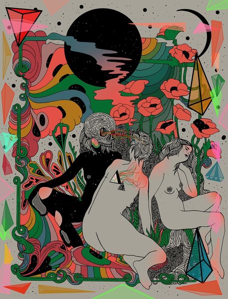 Cassidy Rae Marietta made this artwork, 'Warm Petals & Salty Shells,' during the 20th century. It's a piece that invites us to consider the complex relationships between life, death, and the natural world. The image employs visual codes that draw from a range of cultural references. The skeleton, a timeless symbol of mortality, is juxtaposed with a nude woman, evoking themes of birth, fertility, and life cycles. Given the artist's lifetime, it's tempting to consider how the piece might reflect the social and political upheavals of the 20th century, perhaps as a reaction to the ever-present specter of death during times of war and social change. The overt eroticism may be read as a challenge to conservative norms. Understanding such an image fully requires an art historian to consider the social conditions that shape artistic production. Research into the artist's life, cultural context, and the prevailing artistic trends of the time would provide a richer understanding of its meaning. Art, after all, is contingent on its social and institutional context.