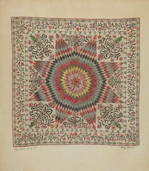 Editor: So, this is Cornelius Christoffels' "Needlepoint Tapestry," from around 1940. It looks like mixed media on textile and drawing, maybe watercolor, too? It has a homey, almost quaint feel to it. Very symmetrical. What do you see in this piece? Curator: Quaint is a kind way of putting it! It's charming, sure, but also kind of...intense, right? I mean, the Pattern and Decoration movement wasn't always about pretty, fluffy designs. Sometimes it was about overwhelming the viewer, challenging notions of 'good taste' in art. You almost feel the hours poured into this, imagining the rhythmic stitching. It speaks to a dedication – or perhaps, obsession? Do you get that vibe? Editor: I do see that. Like, the dedication required to make something like this. Do you think it's actually a plan for a needlepoint, rather than a needlepoint itself? Curator: Absolutely. It's almost too pristine, isn't it? And look at the precision of the watercolour washes mimicking the textures of textile. Very meta! It reminds me of some design ideas of William Morris – that urge to reclaim beauty in the everyday, to bring art into the home, even if through a somewhat laborious process. Makes you want to pick up a needle, or perhaps more realistically, admire the skill from a safe distance! Editor: Yeah, safe distance for me! But it's fascinating to think of it as a plan, like a little map for creating something beautiful and tactile. I never thought about textile art that way. Thanks! Curator: My pleasure! It is like a map of sorts - both a beautiful creation on its own, but it gives direction toward what it might eventually become. And I hadn't ever pondered it in such practical terms, either. Every stitch, accounted for.