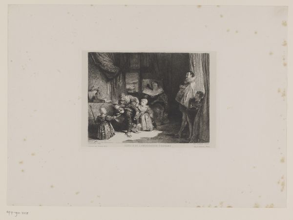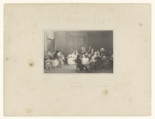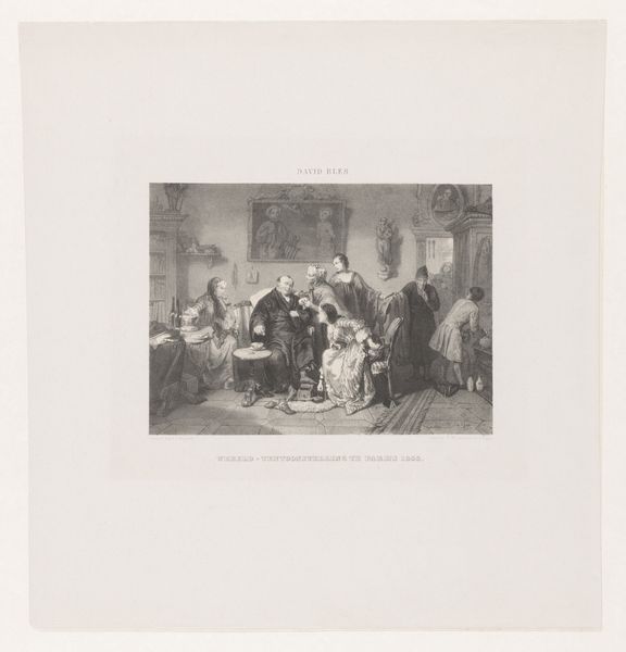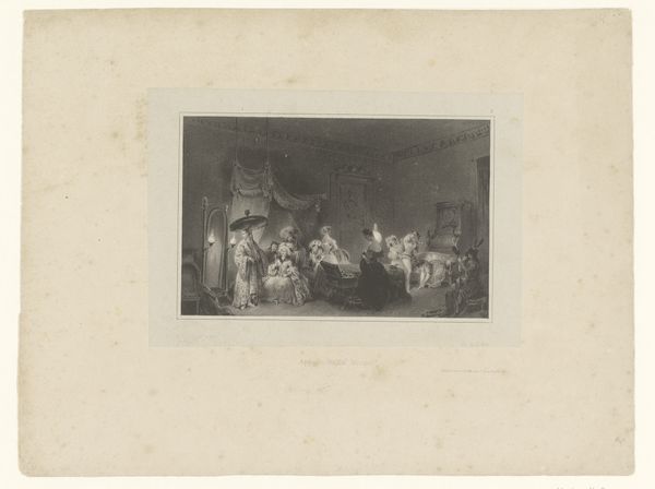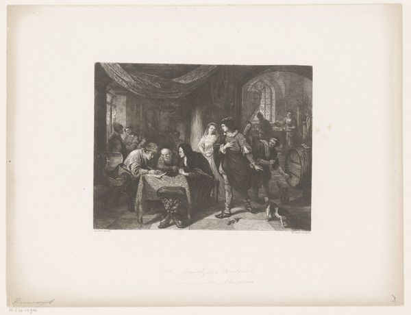 Editor: Here we have Jean-Baptiste Madou’s "Gezelschap in een interieur rondom tafel", or "Company in an Interior Around the Table", created between 1835 and 1837. It’s a print, an engraving on paper, currently residing in the Rijksmuseum. It’s incredibly detailed, but feels a bit staged, almost like a scene from a play. What stands out to you? Curator: Ah, yes, "staged," an astute observation! It certainly whispers tales of grand narratives and studied elegance. Tell me, does it perhaps remind you of the theater itself, with figures caught in a dramatic pose? It has an illustrative feel – I imagine its distribution as part of a larger book, like characters lifted from the pages of Sir Walter Scott, caught mid-sonnet. Editor: I can see that, the theatrical quality. The way the light falls almost feels like a spotlight. So, would this have been considered history painting or genre painting? I guess I’m struggling to fit it in one category. Curator: Now, there's the rub! Genres blur and bleed like watercolor. Here, it seems to embrace both, doesn’t it? There's a desire for accuracy in dress, and hints of recognizable types... but inflated, perhaps a little exaggerated, through a romantic lens. So tell me, what emotions arise when you gaze upon it? Does it tug at your heartstrings or merely pique your intellectual curiosity? Editor: Hmmm, mostly curiosity, I think. It makes me want to know the story behind the image, more than feel an emotional connection to these figures. I can appreciate the skill, especially the intricate details, but it feels a bit…distant? Curator: Precisely! That distance, my friend, is part of its charm. Madou invites us not to weep with them, but to observe, analyze, and, perhaps, invent our own narratives. This distance helps in reflecting back on where the line between the historical account ends and Romantic idealisation begins. It gives a space for reinterpretation – which for me, is one measure of lasting art. Editor: That's a really interesting way to think about it – art as an invitation to create our own story. I hadn't considered that distance as a strength before! Curator: Sometimes, my friend, the greatest treasures are found not in what we immediately feel, but in the questions a piece inspires within us, prompting thought over empathy, or in tandem. A delicious ambivalence if I may say so.