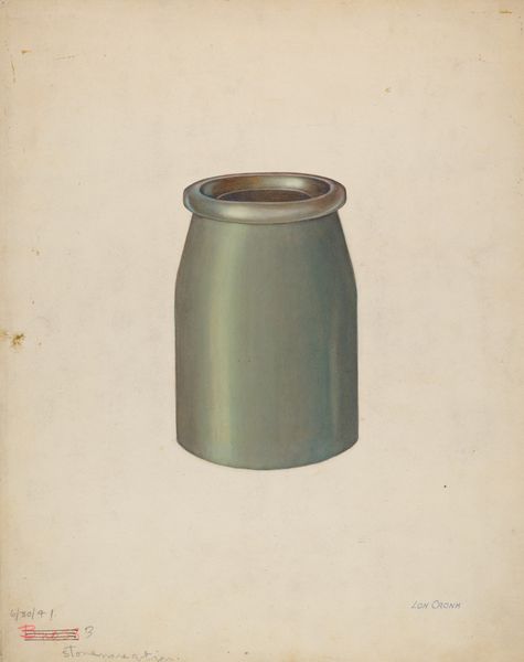 Editor: Here we have Annie B. Johnston's "Pottery Jar with Lid," dating back to around 1938. It seems to be a rendering of a ceramic jar using drawings and watercolors. The artwork has a quiet, unassuming presence. What stands out to you as you view this piece? Curator: It's a wonderful object to consider. It is seemingly mundane, yet the cultural memory it evokes is significant. Think about what jars like this were historically used for. Preserving food, yes, but also keeping precious items safe, both tangible and, metaphorically, emotional. What does it mean to you that Johnston chose to depict this, of all objects? Editor: Perhaps it's a way to honor the everyday objects and domestic life of the time? A form of preservation in itself? Curator: Precisely. And it points towards a particular cultural aesthetic, the importance of home, self-sufficiency, and the careful stewardship of resources. Notice how Johnston’s rendering almost sanctifies the jar. It's presented isolated, self-contained, almost like an icon. Do you see any psychological projection? Editor: It's interesting you mention projection. It feels very stoic and grounded, a visual representation of reliability and perhaps the self. Curator: I agree, there's an inherent sense of steadfastness. Think also about the symbolism of containers throughout history: wombs, graves, treasure chests... Johnston's work invites us to ponder what we, as individuals and as a society, deem worthy of safeguarding. Editor: It definitely provides more layers to ponder than I initially thought. Thank you for sharing that perspective. Curator: And thank you for prompting the discussion; these seemingly simple images are always the most profound!