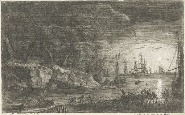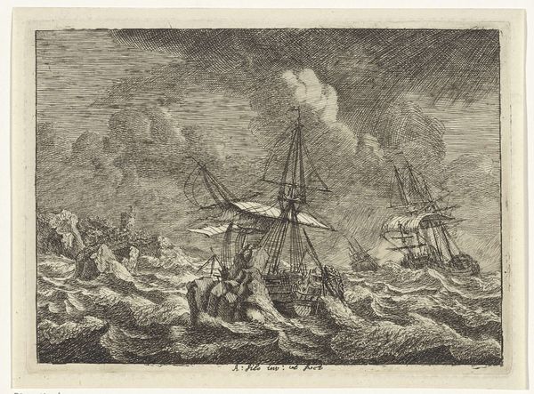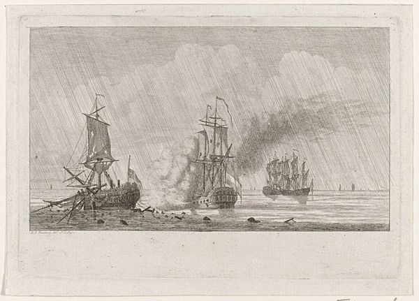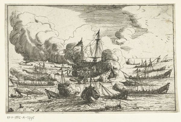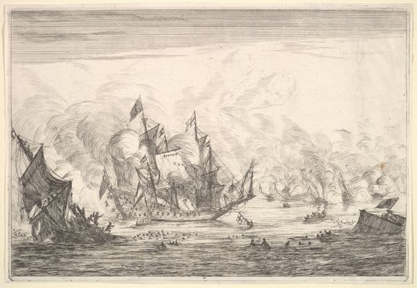 Editor: This is "Zeeslag met zinkende schepen," or "Naval Battle with Sinking Ships," an engraving from between 1722 and 1784 by Simon Fokke. It feels overwhelmingly chaotic. The image is filled with so much action and destruction, what symbols or narratives do you see playing out? Curator: Indeed, it's quite a dramatic scene! Beyond the obvious narrative of naval conflict, consider the recurring imagery of smoke. Smoke often obscures clarity, representing confusion, uncertainty, but also the transient nature of power and victory. What might the act of a ship sinking symbolize? Editor: I suppose a ship sinking could mean defeat, loss of life, and the impermanence of material things. Does the way the scene is composed amplify any particular themes? Curator: Notice how the sinking ship in the foreground is juxtaposed with the active battleships further back. The eye is drawn not only to the immediate devastation, but to the continuation of conflict. It's a deliberate construction—what might that signify about the cultural understanding of war at the time this print was made? The repetition of flags too could evoke questions about national identity, authority, and rivalry. Do you observe how the light, or its absence through shading, creates dramatic contrast? Editor: Now that you point it out, the darker shades really do highlight the intensity of the chaos, guiding my eye toward those dramatic clashes, those intense points. And, now that I'm paying more attention, those billowing sails aren’t only about propulsion but a grand show of military strength. Thanks for sharing that, it shifts the whole tone for me! Curator: Indeed, those kinds of recurring themes and symbols are ways cultures and artists encode emotional, cultural, and psychological weights into a single image, preserving meaning through repeated visual motifs. Understanding those is a lifetime study!