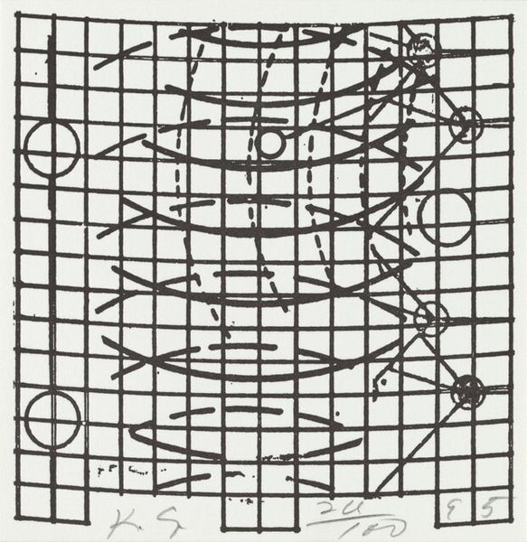 Curator: Richard Smith's "IV" presents us with a stark interplay of form and ground, doesn't it? The stark black lines against the white evoke a sense of rawness and immediacy. Editor: Absolutely. My first impression is that it's a bit unsettling. The irregular, almost frantic, charcoal lines create a feeling of confinement, especially juxtaposed with the grid. Curator: It invites a dialogue about the relationship between structure and freedom, perhaps mirroring social constraints. Is the grid representing societal norms, while the charcoal signifies rebellion or escape? Editor: Or is it about the materials themselves? The grid printed, precise, versus the charcoal, messy, handmade, reflecting tensions between industrial and craft production. Curator: I hadn't considered the material juxtaposition so explicitly, but that is a powerful way to view the piece and its commentary on production. Editor: It feels very deliberate, a critical exploration of the means of creation. Food for thought, certainly. Curator: Indeed, a potent piece, urging us to question boundaries, both artistic and societal. Editor: Yes, forcing us to acknowledge the complex tensions in our own making and consuming processes.