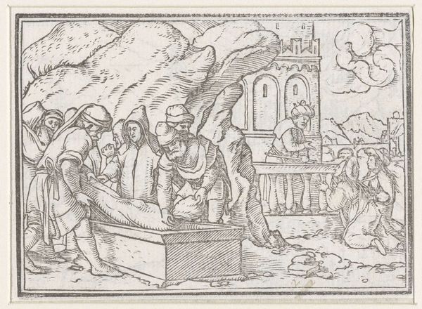 Curator: Let's consider this print, "Ex. 1" by Hans Holbein the Younger, housed here at the Harvard Art Museums. There's no precise date available. Editor: It's stark, almost brutally so. The dense cross-hatching gives it a very immediate, tactile quality, and I can't help but notice the labor involved. Curator: It evokes a strong sense of historical context. How does the positioning of death and mourning connect with broader themes of mortality and faith in the 16th century? Think about the social narratives Holbein was engaging with. Editor: Right. The printmaking process itself, the meticulous carving, the reproduction... it democratizes the image, brings the discourse on death to a wider audience than, say, a commissioned painting. Curator: And what about the gendered aspects of mourning? The figures surrounding the body—how are they positioned within the narrative of loss and remembrance? Editor: Interesting point. I'm also thinking about how the materiality impacts our reading. The starkness forces us to confront the scene, the wood itself, in a way that feels very present. Curator: It is compelling how the work continues to push us toward thinking about the labor of making art and the narratives that works of art provide. Editor: Absolutely. This piece reminds us that art, even in its somber depictions, always reflects a complex interplay of materials, meanings, and social realities.