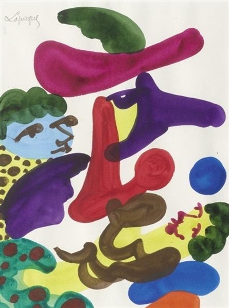 Editor: This is "L'oiseau Vert" by Maurice Esteve, created in 1961, using acrylic paint. The arrangement of shapes is so intriguing, almost playful! What do you see in this piece? Curator: It strikes me as a commentary on the evolving role of abstraction in post-war European art. Esteve, rooted in post-impressionism, here seems to be grappling with the burgeoning influence of American Pop Art. Note the juxtaposition of organic, biomorphic shapes alongside flat planes of color reminiscent of advertising. Do you think this reflects the increasing commercialization of art in the 1960s? Editor: I hadn’t considered the influence of pop art here, but now that you mention it, the bold, flat colors and simplified forms definitely suggest that. But why title it "The Green Bird?" Curator: Ah, the "Green Bird." That tension between the abstract and the referential is key. While seemingly non-representational, the title implies a search for recognizable forms amidst abstraction. Could it be a nostalgic nod to nature amidst the burgeoning urban landscapes of the time? Perhaps even a commentary on the artificiality of modern life replacing the natural world. Editor: So the "Green Bird" could be seen as a yearning for something lost? Curator: Precisely! A yearning reflected not just in the subject but also in the formal choices. Consider the post-impressionistic roots striving for dominance against the flat graphicness that seems to try to push its way forward. It’s an internal battle reflected, arguably, in the art world and larger culture. Editor: I see it now; the artwork is kind of speaking about a moment of great tension in art history. Thank you, this has been so enlightening! Curator: My pleasure! It’s in such dialogues that these painted histories truly reveal themselves, allowing us glimpses into a changing society.