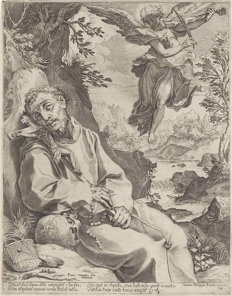 This engraving, titled 'Saint Francis Comforted by an Angel Playing Music', was created by an anonymous artist. Images of Saint Francis such as this one were particularly important as vehicles for piety. Here, Francis leans against a rock, a crucifix in his arms, while an angel descends to play the violin for him. The presence of the skull at his side reminds us of mortality and the transitory nature of earthly life, a common theme in art of this period. Note the musical instrument: music and harmony as metaphors for divine order were thought to lift the soul towards God. The very act of depiction is itself a complex negotiation between what is shown and what remains unseen. Consider, for example, how the artist uses light and shadow to emphasize Francis’s vulnerability and spiritual devotion. It's a potent reminder of the intertwined nature of faith, suffering, and the search for divine solace.