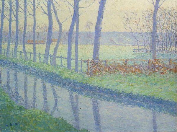 Editor: This is “Canal in Flanders” by Théo van Rysselberghe, painted in 1894 with oil paint. What a beautifully still image. I'm curious how you interpret the repetitive lines of trees. Curator: Those lines, they speak to something profound about how we organize our world. Consider the canal itself – a deliberate cut through the landscape. Rysselberghe is drawing attention to humanity’s influence on nature. Don't you find the strict repetition almost... unsettling? Editor: Unsettling, yes, maybe because it feels both natural and artificial. Like, the trees are natural elements, but they are lined up so precisely! It does create a kind of tension. Is that sense of imposed order common for that period? Curator: Absolutely. Late 19th-century art is filled with anxiety over industrialization, urbanization. Look how he uses pointillism to almost pixelate the scene. Each small dot contributes, but fragments the experience. Is he critiquing the coldness of modernity, maybe? Or highlighting its inherent beauty? Perhaps both... Think about it. Does it recall the collective social fabric where individual acts amass? Editor: So, the dots aren't just about light, they also act as little building blocks to reflect larger themes? Curator: Exactly! In every carefully positioned dab of colour, we find reflections of societal structures and cultural values of the artist's period, and our own! Editor: That gives me a lot to ponder! I never thought about the dots as having so much weight beyond just optical mixing. Curator: Precisely. Every stroke and every subject is laden with history.